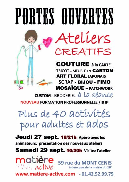 L'occasion de rencontrer les animateurs autour d'un verre et découvrir les nouveaux ateliers, les créations à réaliser en atelier et l'atelier lui même. Séance de rattrapage, les Portes ouvertes continuent samedi 29 toute la journée 10/20h : venez visiter l'atelier en pleine effervescence avec un atelier bijou à 10h30 et des ateliers couture le matin, un atelier scrap en début d'apres midi ou meuble en carton à 16h30 (il reste quelques places)... Une visite guidée par Laurence, votre dévouée ;) à qui vous pourrez poser toutes les questions pour trouver l'atelier qui va bien !