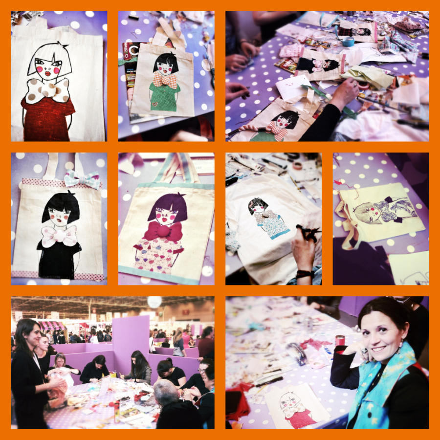 En partant d'un même personnage imaginée par la créatrice, les participantes ont personnalisé un petit sac en coton et pour l'une d'entre elle un T-shirt, en jouant avec les matières, les couleurs et les imprimés, ce qui donne à l'arrivée des créations singulières qui reflètent la personnalité de chacune.