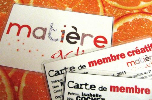nouveau Une carte de membre Matière active est enfin disponible pour les fidèles des ateliers ! CARTE DE MEMBRE CREATIF - 1 an, de date à date - 199 eurosComprend : 2 ateliers gratuits au choix (valeur 129 euros), le 1er et le 10ème atelier et tous les autres ateliers à -30% et stages à -20% !