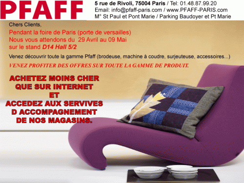 Vous cherchez une bonne machine à coudre ?Laurence — Le jeu, 22/04/2010 - 11:32Vous cherchez une bonne machine à coudre ? Notre partenaire Pfaff, dont nous utilisons les machines pour leur qualité et leur robustesse en ateliers couture, sera à la Foire de Paris fin avril. L'occasion d'aller essayer, se faire conseiller et choisir enfin une vraie machine de pro à un prix salon !