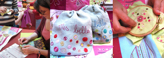 Point avant, de tige, de piqûre, de nœud, de bouclette, point festonné, point d’araignée et même point d’araignée festonnée… Vous repartirez avec la fiche de points et le cercle à broder.