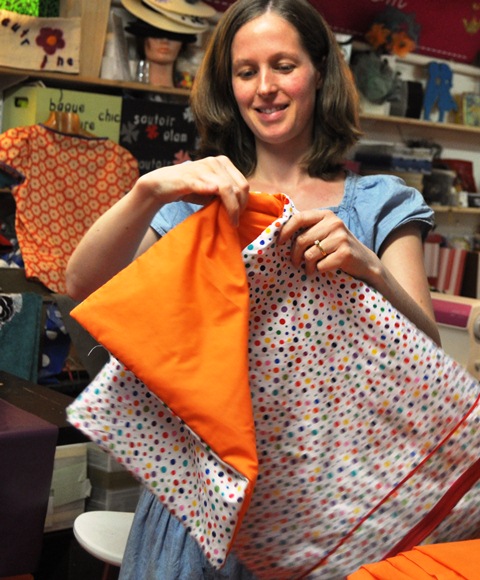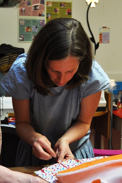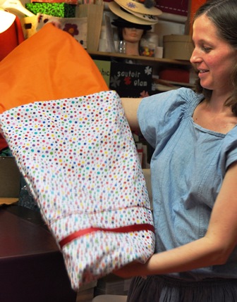mer, 25/07/2012 - 15:37 — LaurenceAmbiance studieuse et créative mercredi dernier avec Karine et Stéphanie venues réaliser un nidange pour la première et un tour de lit pour la deuxième. Stéphanie qui était déjà venue en cours de machine à coudre, avait déjà en tête une association de tissu pour le tour de lit qu'elle souhaitait faire, avec un très beau velour coordonné à la chambre de bébé. Appliquée, elle a même trouvé en boutique le ruban idéal pour la touche finale. Karine, elle, a flashé sur un tissu à pois qui va faire pétiller la chambre du petit dernier. Elle s'est tellement bien appliquée pour sa première fois en machine à coudre qu'elle a réalisé haut la main son nidange. Chapeau bas les (futures) mamans!
