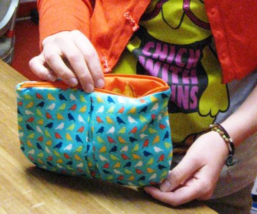 sam, 31/12/2011 - 13:55 — LaurenceMarie s'est vu offrir 3 ateliers et pour le premier de la série, elle a réalisé une pochette zippée doublée et à pli, haut la main ! Il faut dire qu'avec la machine à la maison, Marie a déjà fait quelques piqûres... mais m'a-t-elle confié, il lui manquait la technique, c'est chose faîte pendant ce petit cours de couture pour apprendre à poser un zip, une doublure... Résultat, une jolie création aux motifs gais comme les pinsons !